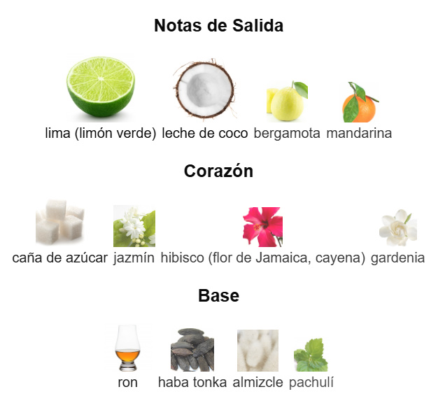 Notas de Salida: lima (limón verde), leche de coco, bergamota y mandarina