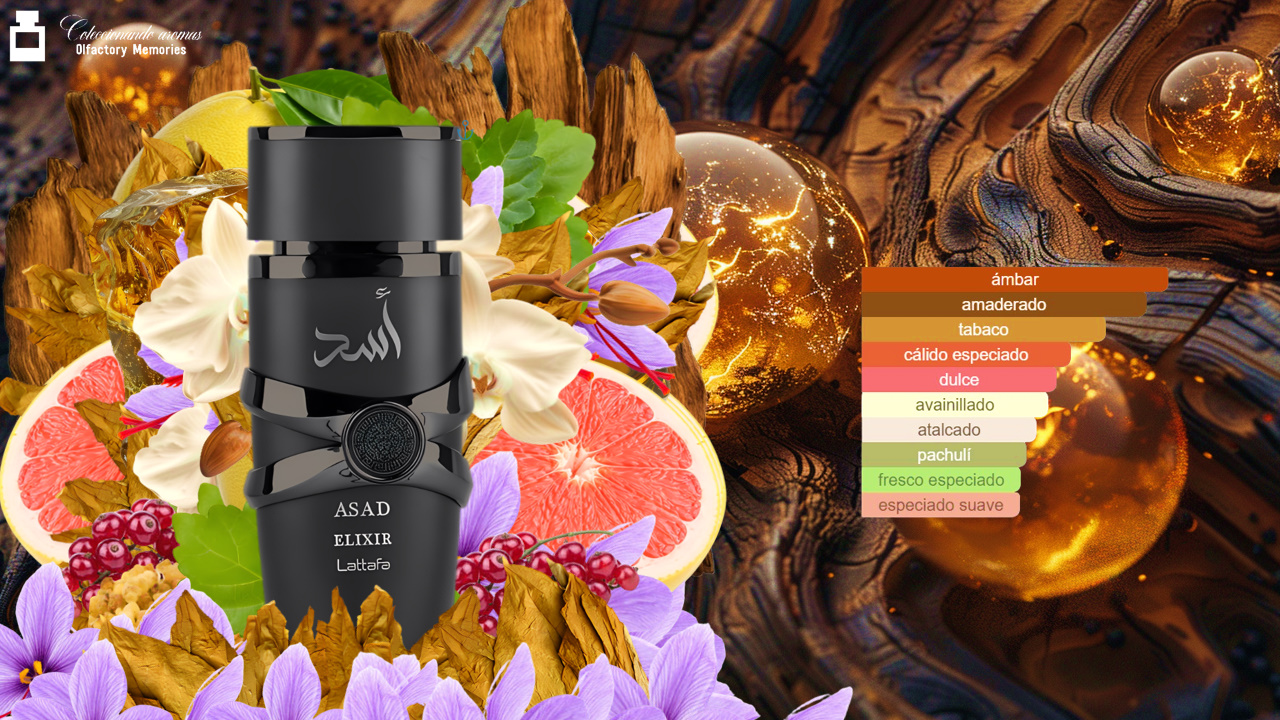Según su ficha olfativa, Lattafa Asad Elixir se construye con una salida de pimienta rosa, azafrán y pomelo; un corazón de tabaco, vainilla y cedro; y un fondo de incienso, ámbar, pachulí y cashemira.