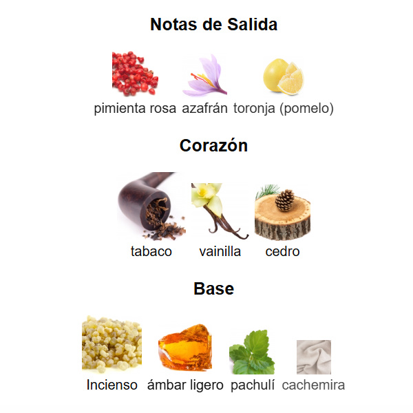 Notas de Fondo: Incienso, ámbar ligero, pachulí y cachemira