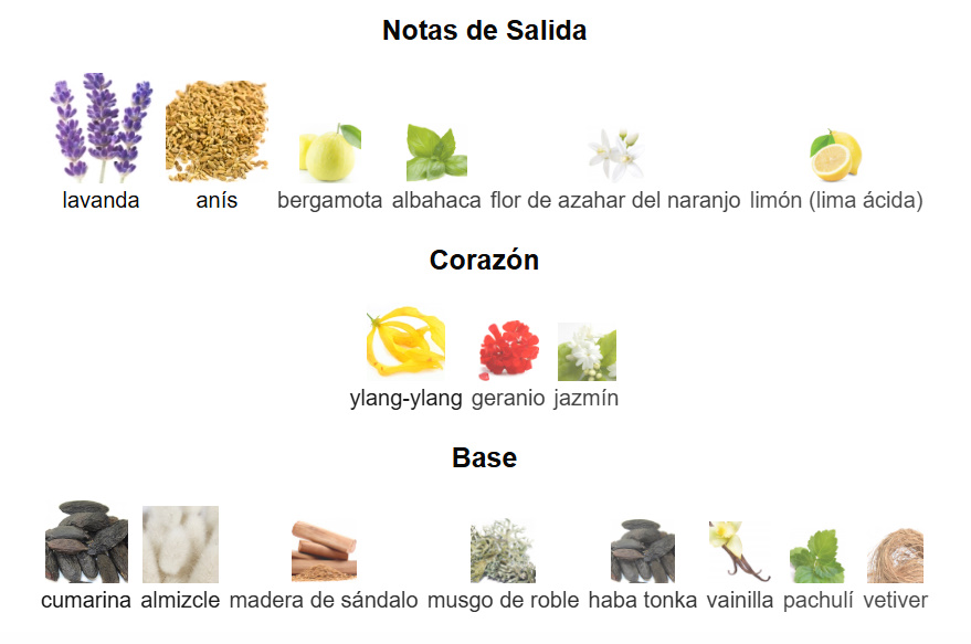 Notas de Salida: lavanda, anís, bergamota, albahaca, flor de azahar del naranjo y limón (lima ácida)