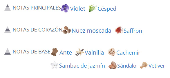 Notas de Corazón: notas amaderadas, nuez moscada, violeta, azafrán y jazmín