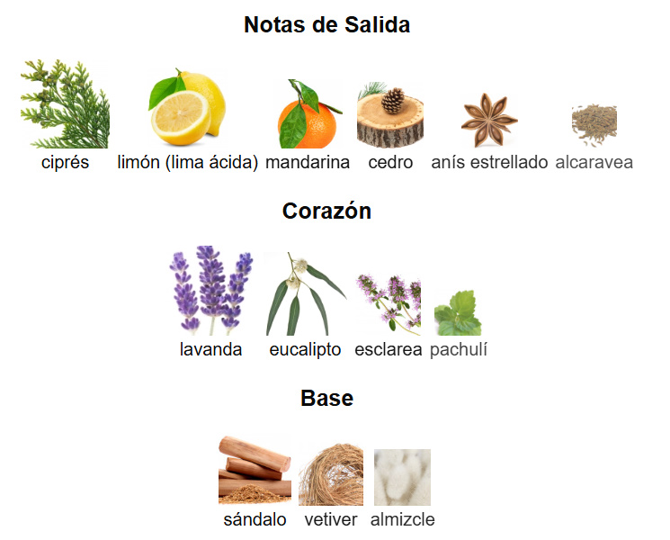 Notas de Corazón: lavanda, eucalipto, esclarea y pachulí