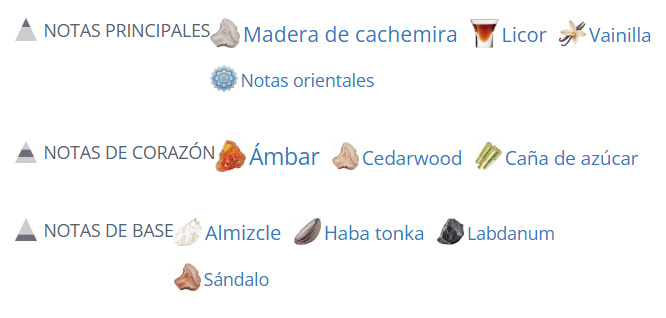 Notas de Salida: notas orientales, Licor, vaina de vainilla y madera de cachemira