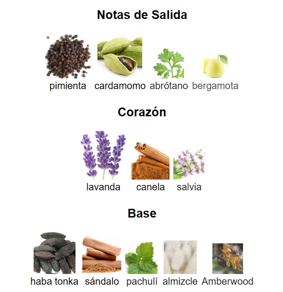 Notas de Corazón: lavanda, canela y salvia