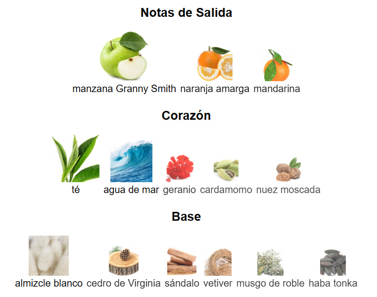 Aparece el trazo de té (negro), cardamomo, nuez moscada y un geranio que aporta ese filo verde-floral tan masculino; algunas versiones listan un matiz marino que ventila el conjunto. Aquí el perfume pierde la chispa del inicio para ganar orden: pasa de cítrico frutal a cítrico-aromático con especias suaves y sensación textil. Estela media y modales impecables para oficina o estudio.