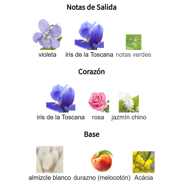 Desde el primer instante, su salida combina la dulzura empolvada de la violeta con la nobleza del iris toscano y un toque de notas verdes que aportan frescura y naturalidad. Al avanzar, el corazón floral florece con una fusión armoniosa de rosa, más iris toscano, y el exquisito jazmín chino, aportando una textura aterciopelada y sofisticada al conjunto.