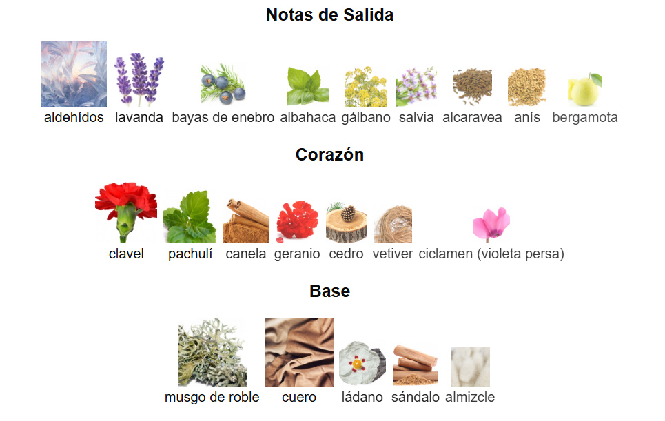 Notas de Salida: aldehídos, lavanda, bayas de enebro, albahaca, gálbano, salvia, alcaravea, anís y bergamota