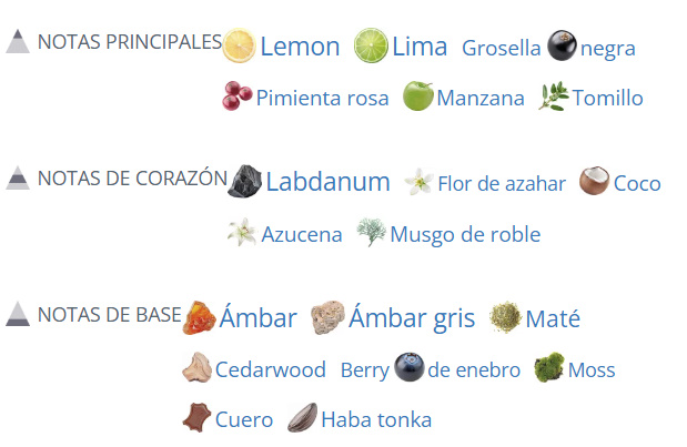 Notas de salida: limón (lima ácida), lima (limón verde), grosellas negras, pimienta rosa, tomillo y manzana