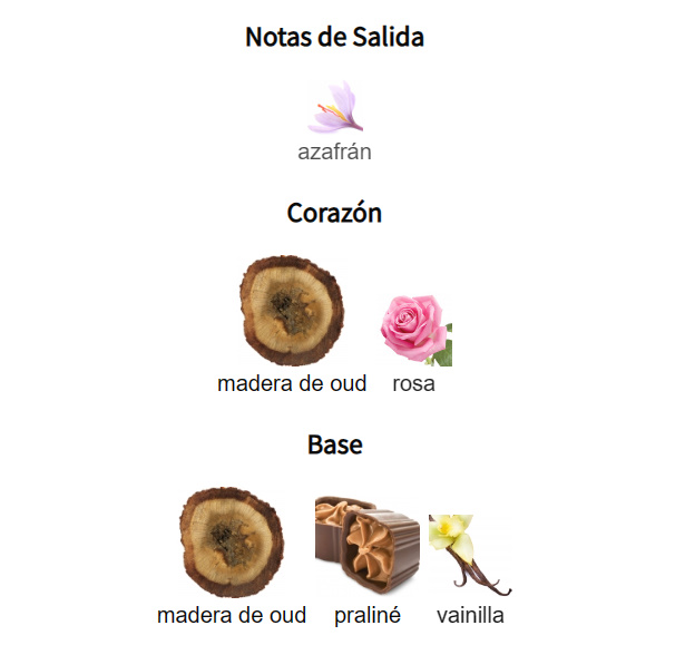 A medida que se acomoda, el perfume deja de “brillar” y empieza a oscurecerse con elegancia. Entra el corazón donde el oud y la rosa se encuentran sin pedir permiso. El oud aquí se siente maderoso, resinoso, con un punto mineral que recuerda al humo fino y a la madera calentada por brasas; la rosa, en cambio, aparece más densa que fresca, como una flor roja con sombras, aportando un contraste que vuelve todo más humano y sensual. La transición es gradual: el azafrán no desaparece de golpe, solo se vuelve un hilo cálido que cose la mezcla por debajo.