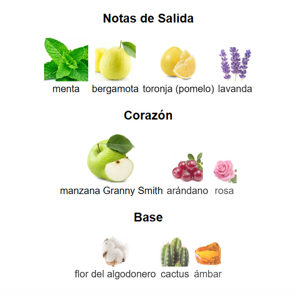 Notas firma: menta, bergamota, pomelo, lavanda → manzana, arándano, rosa → flor de algodón, cactus, ámbar.