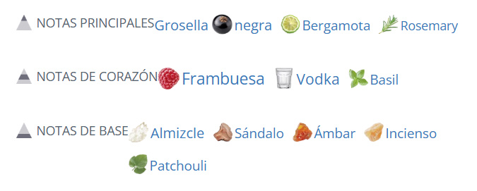 Notas de salida: grosellas negras, zarzamora (frambuesa negra), romero y bergamota